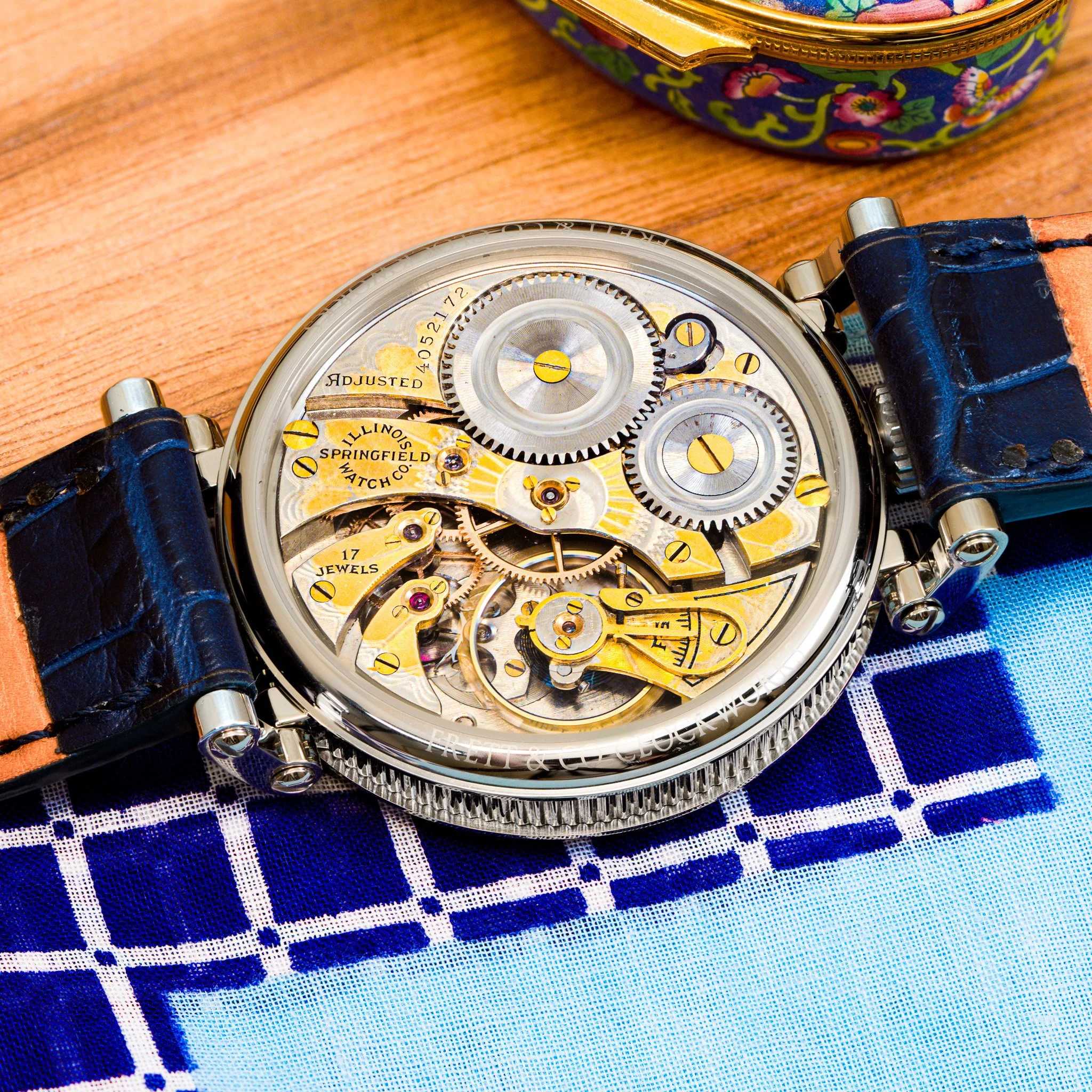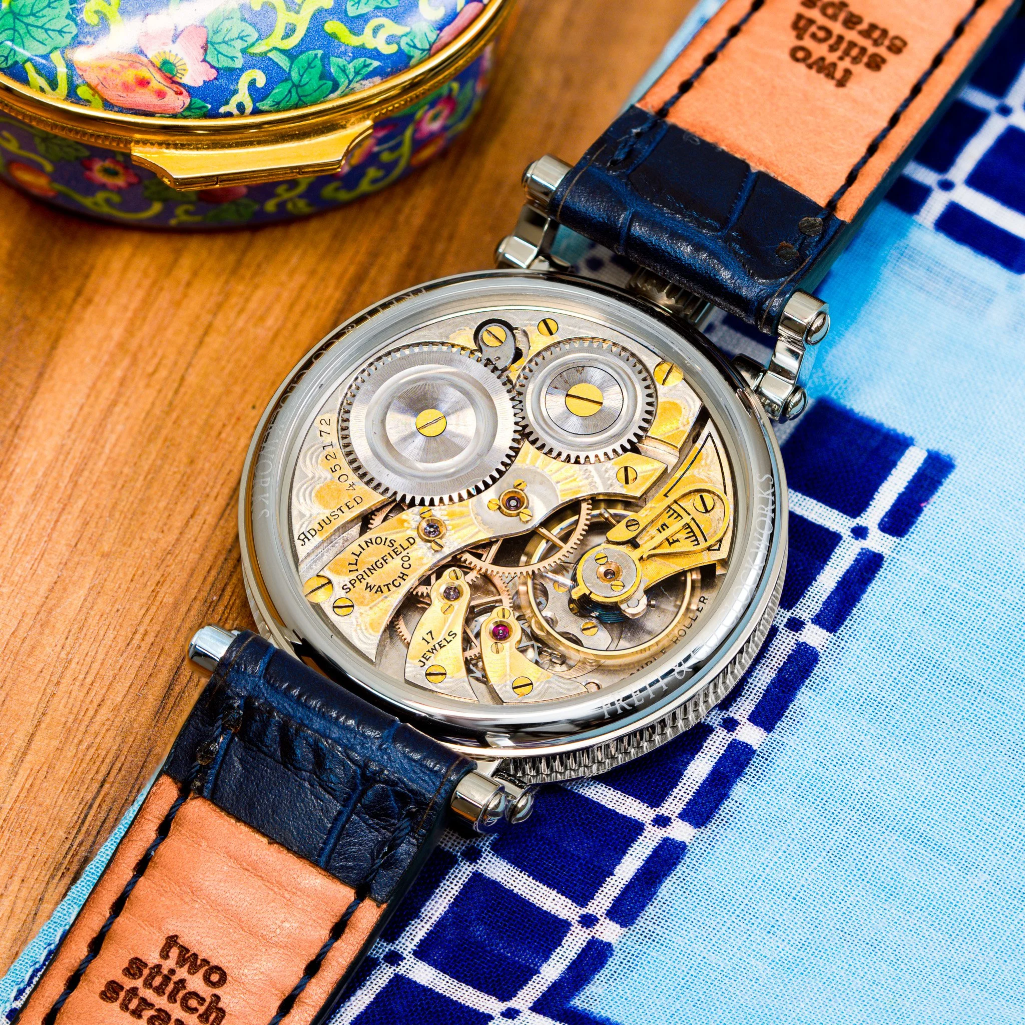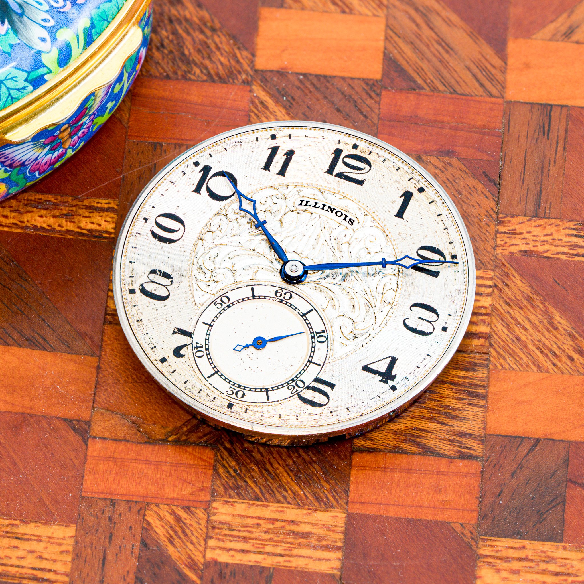 Completed in Springfield, Illinois in 1922, this Illinois timepiece was manufactured with a two-tone movement. To achieve this finish, the movement was first plated in nickel and then selectively flashed with gilt, producing rich golden tones over the silver base. This was a highly labor-intensive process reserved for select higher-grade movements, and many of these finishes have been damaged over time. This example remains pristine. Even more impressive, the movement still retains its original gold-tone hardware added by Illinois at the time of manufacture, making this a rare example of an original two-tone movement with matching golden accents. In our workshop in Little Rock, Arkansas, the plates, jewel settings, gear train, balance, and balance weights were individually hand polished to restore the movement’s original brilliance while carefully preserving the factory-applied two-tone finish. On the dial side, this piece features a striking metal dial with an elegant guilloché center. Bold Arabic numerals sit on the outer chapter ring, paired with a clean minute track marked by bold indices every five minutes. The original heat-blued hands remain unrestored and provide exceptional contrast against the dial, completing a dial layout that is both highly legible and visually refined. From top to bottom, this piece is incredible.