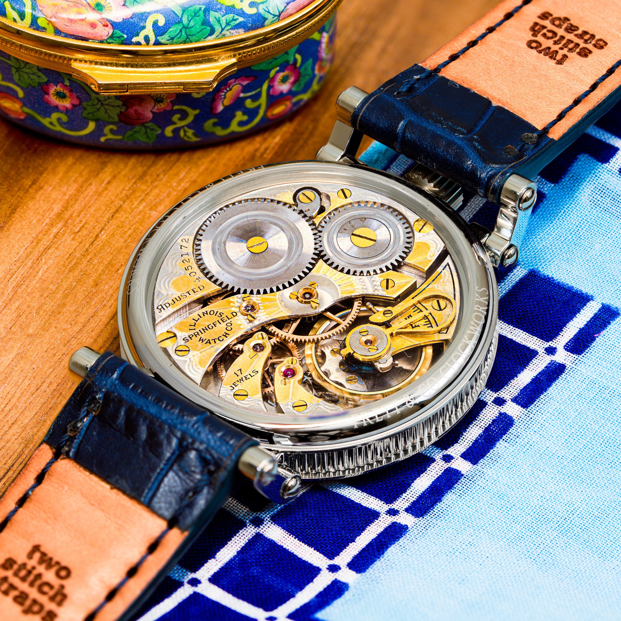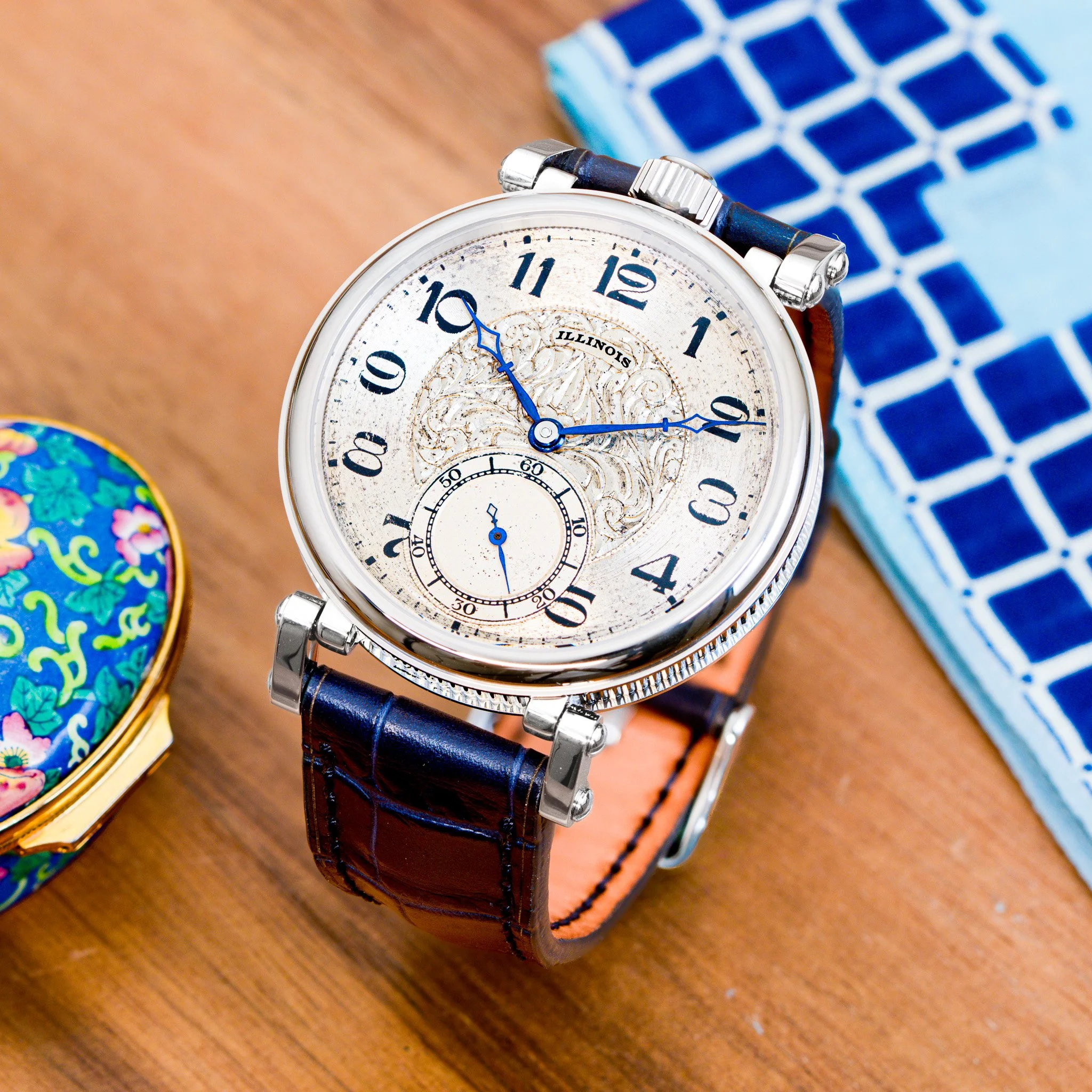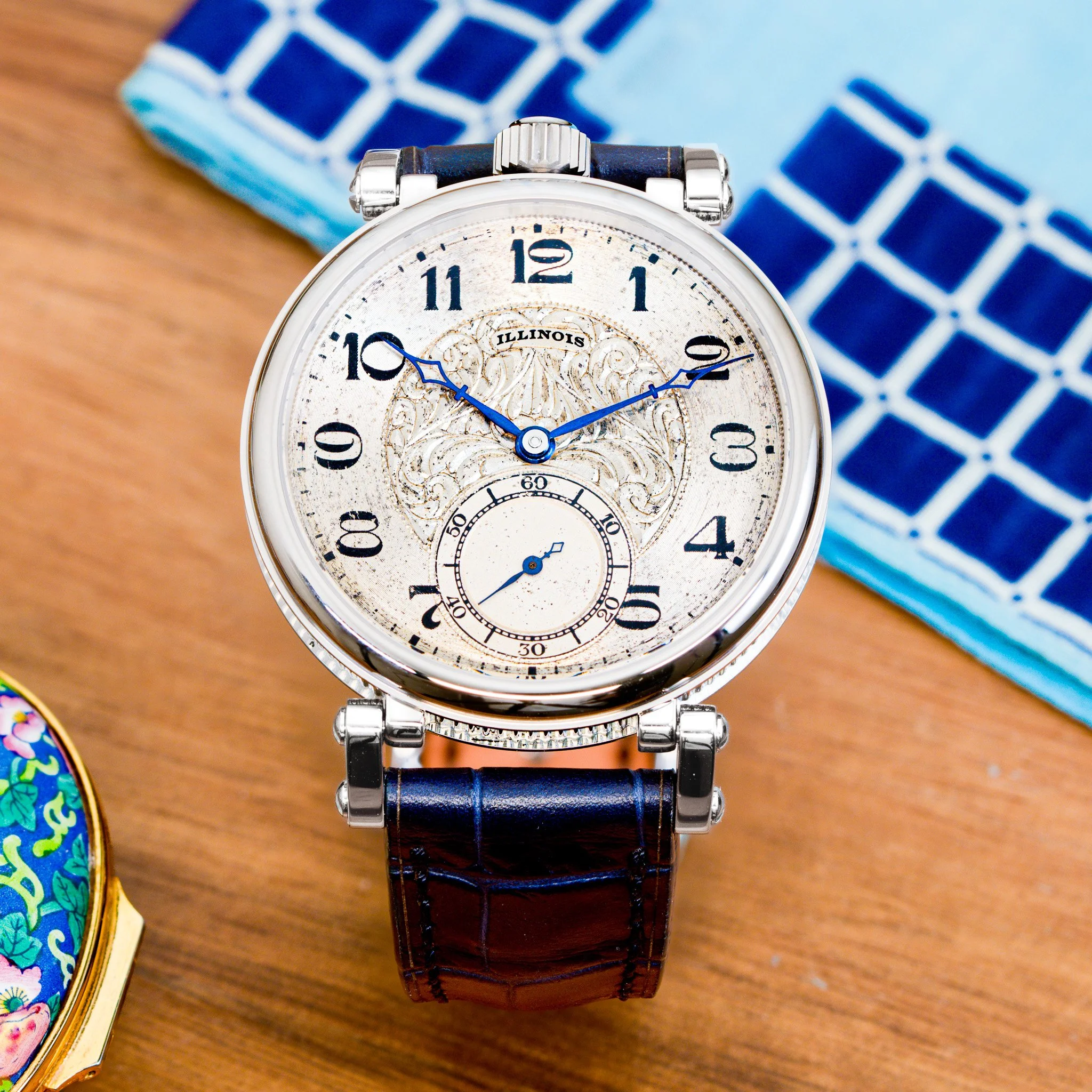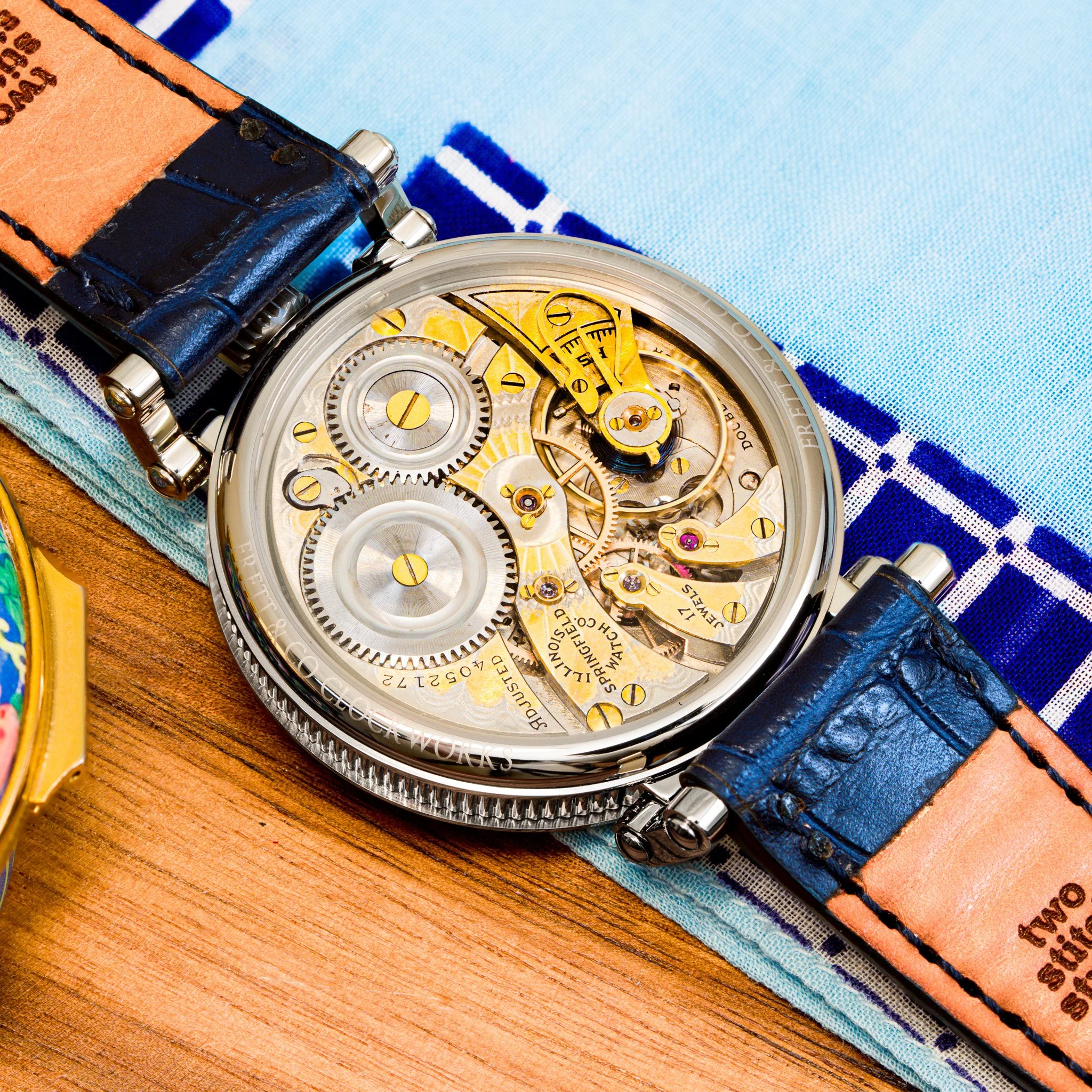 Completed in Springfield, Illinois in 1922, this Illinois timepiece was manufactured with a two-tone movement. To achieve this finish, the movement was first plated in nickel and then selectively flashed with gilt, producing rich golden tones over the silver base. This was a highly labor-intensive process reserved for select higher-grade movements, and many of these finishes have been damaged over time. This example remains pristine. Even more impressive, the movement still retains its original gold-tone hardware added by Illinois at the time of manufacture, making this a rare example of an original two-tone movement with matching golden accents. In our workshop in Little Rock, Arkansas, the plates, jewel settings, gear train, balance, and balance weights were individually hand polished to restore the movement’s original brilliance while carefully preserving the factory-applied two-tone finish. On the dial side, this piece features a striking metal dial with an elegant guilloché center. Bold Arabic numerals sit on the outer chapter ring, paired with a clean minute track marked by bold indices every five minutes. The original heat-blued hands remain unrestored and provide exceptional contrast against the dial, completing a dial layout that is both highly legible and visually refined. From top to bottom, this piece is incredible.